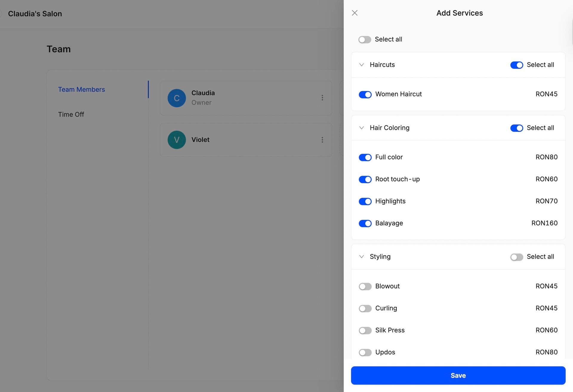 Select the services each team member provides, so clients can choose their preferred expert when booking online